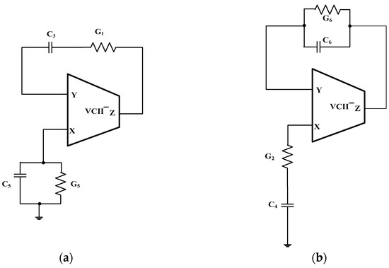 In (7), the plus and minus signs are for VCII− and VCII+ respectively. To ensure a pure sinusoidal oscillation, the CE in (7) should be a second-order polynomial with purely imaginary roots. This requires the network NGC to include at least two capacitors. It has to be noted that, in Figure 2, by using a VCII+ rather than a VCII−, at least three capacitors are required to provide a phase shift to generate a positive feedback loop. Therefore, no canonic oscillator is possible using VCII+, and for the following, we will consider the VCII in Figure 2 as a VCII−. By then assuming a network with only two capacitors, Equation (7) will be in the form: