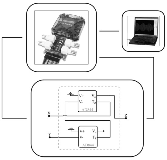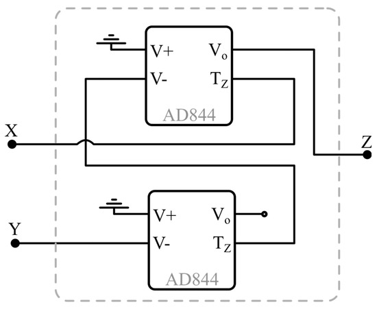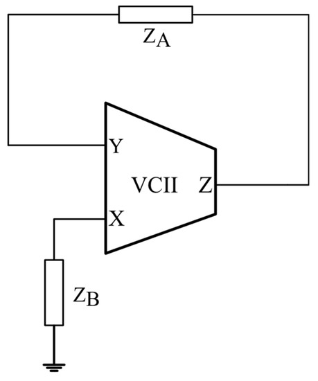 Then, we have used the commercially available AD844 to configure a VCII− as shown in Figure 9. A single VCII is realizable using two AD844 ICs, whose Spice model can be found in [45]. The situation is quite different in the case of an integrated design, where a single VCII block can be exploited to design the oscillator, as shown in the previous sections.