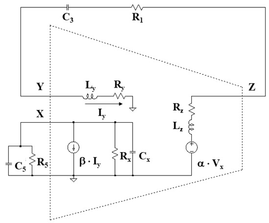 Prime variables are considered for and to account for parasitic resistances Ry and Rz and admittance Yx, as in the previous subsection, and we have