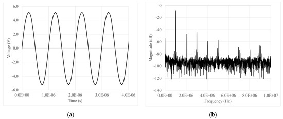 An example of the output signal, both in the time and frequency domains, is reported in Figure 13a,b for a frequency of 1 MHz.