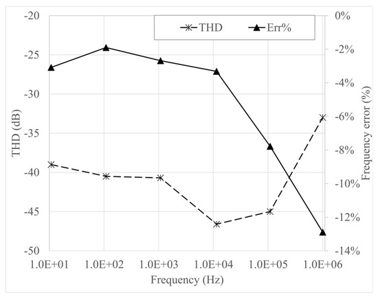 Finally, experimental verification of performance has been carried out, exploiting the test bench shown in Figure 12: for data acquisition, the Digilent Analog Discovery 2™ board was used [46]. The design of Figure 5a was implemented as the reference topology for the oscillator. Measurements were carried out in the range (10–106) Hz and are reported in Table 3. In agreement with simulation results, the oscillator shows a very low THD value even at 1 MHz (considering 10 harmonics). The average relative frequency error between measured and ideal values is −5.2% and is comparable with tolerances of the passive components.