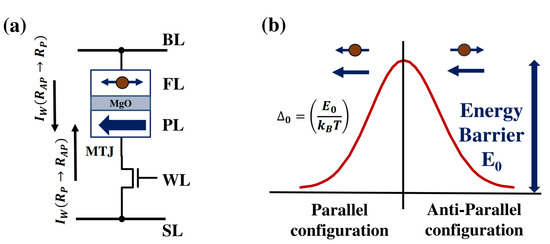 (a) STTRAM bitcell; (b) MTJ two states separated by an energy barrier [25].