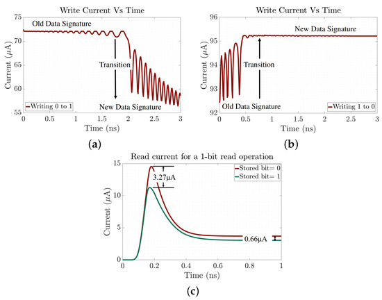 (a) for 0→1, (b) for 1→0 and (c) for ‘0’ and ‘1’. Write current magnitude and waveform is a function of stored data and a distinctive gap is present between write ‘1’ and ‘0’ and as well as read ‘1’ and ‘0’ currents, which can be leveraged as side channel signature [25].