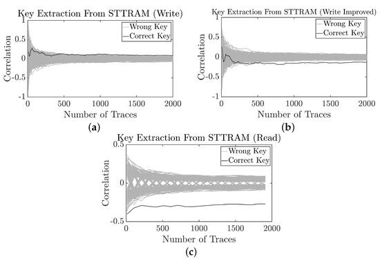 Attack result for (a) STTRAM (write); (b) STTRAM (write) after pre-processing; (c) STTRAM (read). An attack is considered successful when the correct key (black) emerges from the cloud of all wrong keys (grey) [25].