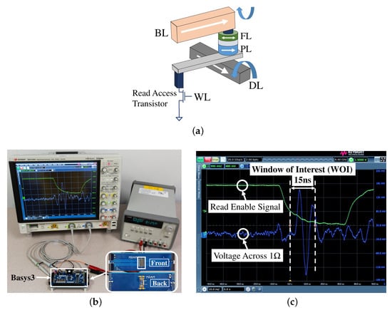(a) MRAM bitcell; (b) experimental setup showing the MRAM chip, the PCB (inset) and the FPGA; (c) snapshot of the oscilloscope capture: green line shows the read enable signal and the blue line shows the voltage across 1 Ω resistor [25].