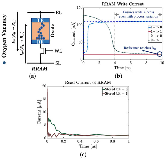 RRAM storage element is mainly an oxide material between two electrodes namely, Top Electrode (TE) and Bottom Electrode (BE) (Figure 7a). The filament between the electrodes can be formed or ruptured based on the direction and magnitude of the electric field through it. If a filament is formed between the two electrodes, the resistance of the cell is low (Low Resistance State, LRS) and that can be considered as data ‘0’. However, if the filament is ruptured, the resistance of the cell is high (High Resistance State, HRS) and that can be considered as data ‘1’.