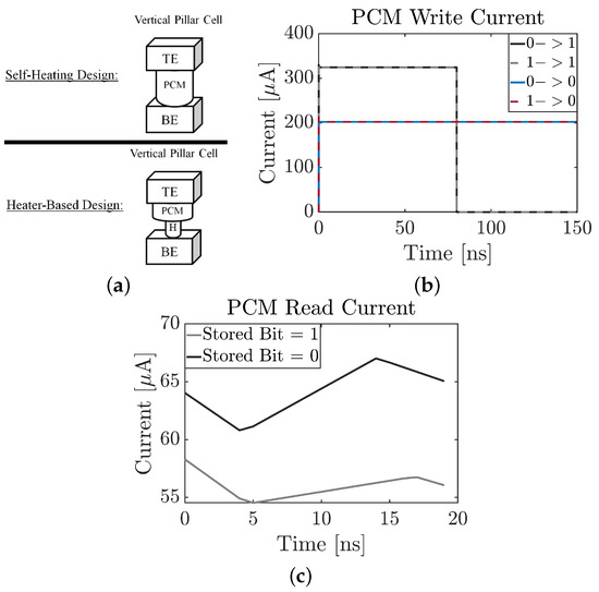 There are two major PCM designs (Figure 9a); heater-based and self-heating-based [39]. The first one contains a material layer (e.g., titanium nitride or tungsten [39,40,41]) that act as a heat source to heat the adjacent layer of phase-change material [39]. The later one relies on the internal generated heat within the PCM and helps the state change of the material [39]. (GST) [40,42] is used as a phase-change material for both designs. Another example of a similar phase-change material is [43].