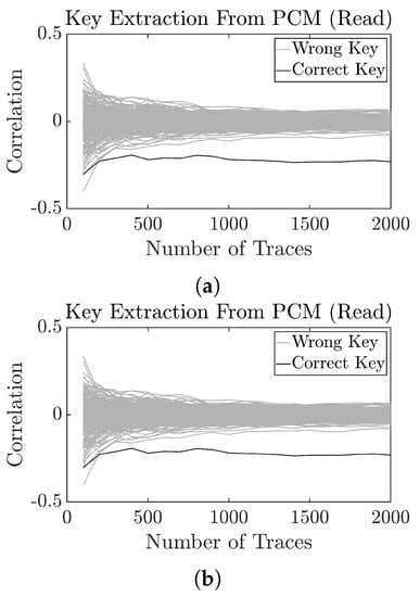 Figure 10a demonstrates the results to extract the first key byte from PCM write operation. The attack is successful, efficient and only takes 200 traces to reveal the key. Furthermore, the full key can be extracted in 400 traces.