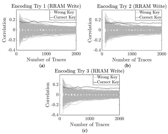 Figure 11. Key extraction from RRAM write operation after implementation of data (a) Encoding Try 1; (b) Encoding Try 2; and (c) Encoding Try 3. - Write Encoding Try 2: Out of 128-bit write data, first MSB 16 bits are encoded with reverse polarity. Figure 11b shows the corresponding successful attack result where the first byte of the key can be retrieved in roughly 950 traces.
