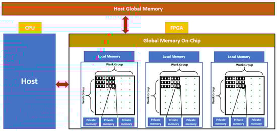 The architectures listed in Table 1 are based on GPU processors. The use of this type of architecture is due to the high computing power. However, the problem here is the high energy consumption, limiting the use of autonomous systems based on monitoring agricultural fields. The use of FPGA on-chip systems can solve this problem. Among the most reliable and robust systems in parallel processing are the CPU-FPGA systems, which contain both a CPU and an FPGA. Figure 1 shows the CPU-FPGA architecture. the host global memory is the memory of the CPU that contains the whole memory. The host is the CPU part of the board. Local memory is the device part (FPGA) memory, which shares the work with the items of each group. Global memory on-chip is the global memory of the FPGA part. The Work Group is a set of work items; the number of work items depends on the configuration chosen in the CPU part. The private memory is that which is not shared with the elements of each work group.
