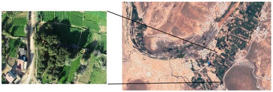 The agricultural field selected in our study is located in the Guelmim-Oued Noun region in the south of Morocco, with a perimeter of 0.81 Km and a surface area of 3.44 Ha2. The coordinates of the agricultural field used in this study are 29°04′39″ N and 10°16′29″ W. Thus, the tools used for collecting our dataset are based on an unmanned aerial vehicle type DJI Phantom Pro4 with an RGB camera based on 1-inch CMOS and 20 Mpx. The lens had an FOV of 84°8.8 mm/24 mm and a focal length f/2.8 auto focus. The left image of Figure 2 shows an example of images collected with the UAV.