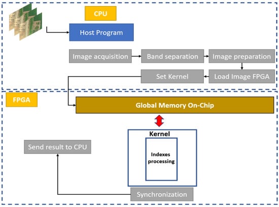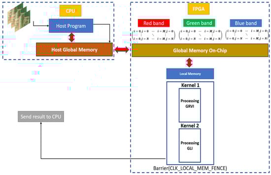 After the naive implementation in the CPU-FPGA architecture, we improved the processing time using the local memory of the FPGA board. Once we acquired the images, the data were uploaded to the FPGA global memory. The local memory was used for kernel processing. In addition, we used two kernels to avoid data concurrency. The first kernel was dedicated to processing the GRVI index, and the second one was dedicated to the GLI index. The evaluation has shown that the second technique gives better results than the first one in terms of processing times. Figure 8 shows the second technique used to improve the first implementation.