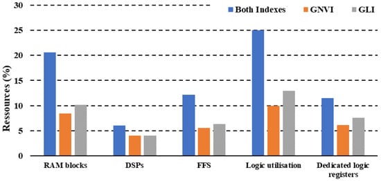 Additionally, FFS showed consumption rates of 5.56% and 6.32% for GNVI and GLI, respectively. In addition, logic usage was 10% for GNVI and 12.96% for GLI. We noticed that the GLI kernel consumed more resources than GNVI, due to the fact that the GLI index is based on three bands in place of two in the GNVI case, which leads to its higher consumption. Table 5 summarizes the different results obtained.