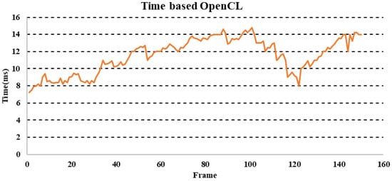 Figure 10 shows the results obtained with the evaluation of the algorithm used on an image sequence. The time varied between a minimum value of 7.23 ms and a maximum value of 14.8, with an average of 11.5 ms. The approach used in this work allowed us to accelerate the second block shown in Figure 6, which was based on the processing of indices. The sequential evaluation of processing time confirmed this choice, which encouraged us to process the first block in the CPU part (host) and the second block in the device part (FPGA) in order to return the results to the host for classification. In the proposed acceleration, we used a naive acceleration based on a single kernel that achieved all the processing. Subsequently, we optimized this implementation in terms of processing time by using the fast local memory of the CPU-FPGA architecture. The tool used in our case was based on OpenCL, both for the naive implementation and the optimized version. The following two pseudo codes (Algorithms 1 and 2) show the processing in the host part and the kernel part.
