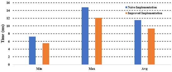Figure 11 shows that the improved version has a mean processing time of 9.31 ms, compared to the naive version’s mean processing time of 11.5 ms. This improvement allows for processing 107 frames/s compared to 86 frames/s in the naïve implementation.