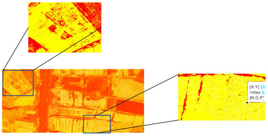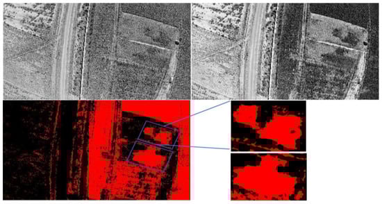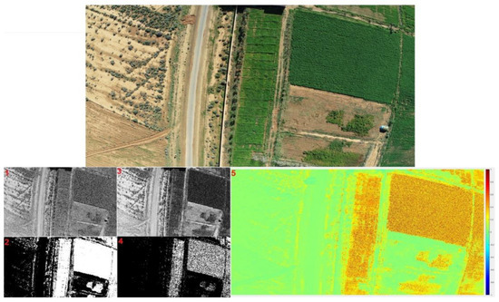 In Figure 12, the top image shows the three bands that build the RGB image. Images 1 and 3 show the R and G bands after the separation of the bands. In image two, we show the GRVI index based on the thresholding operation. The threshold used in this image is 0.3. In image four, we tried to change the threshold to 0.45 to show the regions with a low index. Figure 13 shows the interpretation of the high index regions.