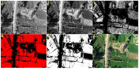 Similarly, for image 4, we used different thresholds to depict the high value of the index in red. Image 5 shows the binary image obtained with the FPGA SoC platform. Finally, image 6 shows the original image based on the three RGB bands. In the same context and to compare the results, we have also evaluated this index in Matlab to compare the software and hardware implementations. Figure 15 shows the results obtained on Matlab.