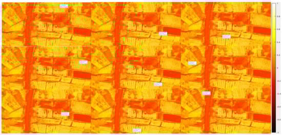 Figure 13 shows the evaluation of the GRVI index. The blue areas indicate regions that have a low index compared to other areas. The interpretation of the results obtained gives the farmer an idea about the agricultural field. The decision is made based on the physiology of each agricultural product. Therefore, the decision and the threshold operation are based on this physiology. Generally, each agricultural product has a specific index threshold. After evaluating the GRVI based on the second agricultural field shown in Figure 3, we evaluated the GLI in the first agricultural field. Figure 13 shows the results obtained.