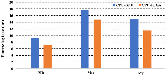 In this study, we have compared XU4 CPU-GPU low-cost architectures with a CPU-FPGA based SoC architecture. The experimental results show that it can take 14.89 ms to process one image with a maximum value of 17.8 ms and a minimum value of 9.2 ms. This processing time was based on the XU4 architecture, which gave a processing rate of 67 frames/s. On the other hand, the processing time using the FPGA SoC architecture was 11.5 ms, which shows that the architecture chosen in this study, along with its low power consumption, reached a processing time lower than the CPU-GPU-based architecture using the same paradigm OpenCL. Figure 17 shows the performances of the two architectures.