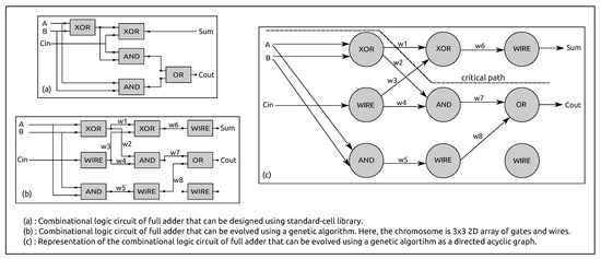 - Soliman, A.T.; Abbas, H.M. Combinational circuit design using evolutionary algorithms. In Proceedings of the CCECE 2003—Canadian Conference on Electrical and Computer Engineering. Toward a Caring and Humane Technology, Montreal, QC, Canada, 4–7 May 2003; pp. 251–254. [Google Scholar]