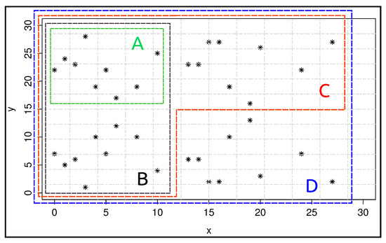 We used GA to design four different combinational circuits. These circuits differ in the number of base points they support. A circuit can support points enclosed in rectangle A in Figure 2 as a base point for scalar multiplication. In other words, a circuit can perform correct multiplication of any six-bit secret key with any point in rectangle A in Figure 2. Similarly, , , and circuits can perform correct scalar multiplication of any six-bit secret key with any point enclosed in rectangle B, C, and D in Figure 2, respectively.