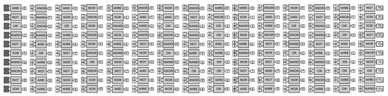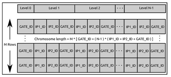 As shown in Figure 3, each gate has two inputs and one output. The outputs of the gates at each level are indexed by numbers from 0 to M. These outputs are connected to inputs of the gates at the next level. Hence, the inputs of the gates at a level are also indexed by a number from 0 to M. Therefore, bits are needed to encode an index (IP1_ID and IP2_ID in Figure 3) in binary. The inputs to a gate at level i can be the output from any gate at level . Finally, the length of chromosome is given by M * (GATE_ID + (N − 1) * (IP1_ID + IP2_ID + GATE_ID)).