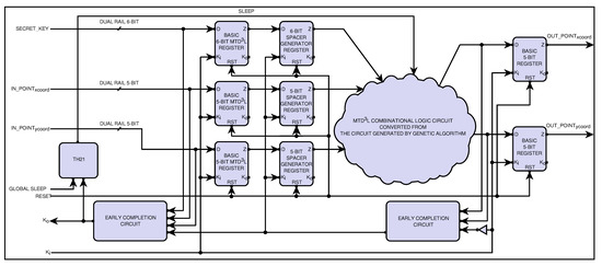 The third security-related design feature of the proposed ECC processor is the usage of circuits. The combinational circuit modules of the cryptosystem (i.e., point addition, point-doubling, and scalar multiplication for the ECC processor) are first generated by a GA and, then these circuits are transformed into delay-insensitive circuits (refer Section 4 and Section 5). eliminates the need for clock signals and is able to perform operations asynchronously by implementing a delay-insensitive hand-shake protocol. This helps enable masking of start times and end times of operations of different sub-blocks or instruction processing, and thus provide nearly constant power traces and energy consumption, which makes it difficult for an attacker to launch timing and power attacks. Finally, circuits show robust circuit operation under process, voltage, and temperature (PVT) variations, and have low noise/electromagnetic emissions, which enhance the robustness of circuits against SCAs [13,14,16].