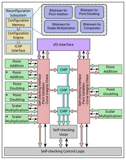 The ECC processor takes input from the I/O interface. Inputs could be point(s) in an elliptic curve, elliptic curve parameters, and/or a scalar value. A self-checking interface fetches the input and performs point-validation and curve integrity-checking to scrutinize any faulty input. Then, it supplies the input to point addition, point-doubling, and/or scalar multiplication module. There are three copies of each of point addition, point-doubling, and scalar multiplication modules inside ECC processor. Two copies of a module operate in dual modular redundancy (DMR) to detect operational error while the third copy is a spare module (indicated by * in Figure 7) and it remains idle (in sleep state) during error-free operation of the modules in DMR. The spare module is activated by the self-checking control unit only when an operational error is detected. The outputs of DMR modules are compared by comparators (CMP). These comparators operate in triple-modular redundancy to provide fault tolerance. The self-checking voter takes the outputs of comparators and generates the voting result. The voting result signifies whether there is any fault in CMP and/or current operating modules in DMR.