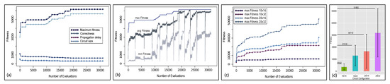 Figure 9 depicts the result of our genetic algorithm execution. As explained in Section 4, the multi-objective fitness function of our GA has three main goals: (i) maximizing the correctness in input/output behavior, (ii) minimizing the circuit delay (i.e., propagation delay), and (III) minimizing the circuit size. As shown in Figure 9a, the fitness value continuously increases as the number of evaluations (i.e., generations) increases. Figure 9a also shows that the correctness value (also fitness value) increases with the number of evaluations, reaching the maximum value at 23,119-th iteration of the evaluations. The propagation delay and circuit size values in the fitness function decrease with the number of evaluations. Figure 9b depicts the maximum (max), average (avg), and minimum (min) fitness values as the number of evaluations increases. Results indicate that the maximum fitness value increases steadily with the number of evaluations; however, the average and minimum fitness value curves can be divided into a number of segments separated by abrupt high-to-low-to-high transitions. These transitions are due to the multiple GA restarts, a property of the CHC GA [40].