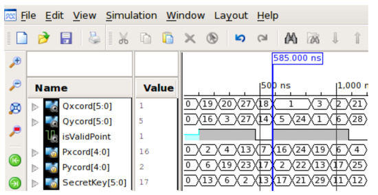 In the public key generation step of ECC, the scalar multiplication involving the base point on the elliptic curve is the critical operation. The base point is a point chosen from the points in Figure 2. The scalar value used in the scalar multiplication operation is the secret key or private key. In this work, we used a secret key with 6-bit length. The security of elliptic curve-based security applications and protocols relies on an elliptic curve discrete logarithm problem—the inability to compute the secret scalar value given the base point and public key.