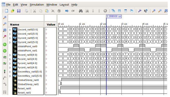Figure 11 shows the waveform of circuit performing scalar multiplication. In dual-rail logic, the 6-bit secret-key is represented by 12-bit dual-rail signals, and the 5-bit base point value is represented by 10-bit dual-rail signals. In addition, two samples are separated by an all-one-spacer or all-zero-spacer. The alteration between various input/output DATA and two spacers are clearly shown in simulation (refer Figure 11). To represent a single-rail signal (say Pxcord[4:0]) in Figure 10) in dual-rail format, we created two signals (Pxcord_rail0[4:0] and Pxcord_rail1[4:0] in Figure 11). The rail1 signal holds the exact value of a single-rail signal, and the rail0 signal holds the one’s complement of the single-rail signal. If Pxcord[4:0] is 2 (or ), then Pxcord_rail1 is 2 (or ) and Pxcord_rail0 is 29 (or ). Therefore, if we monitor the value of rail1 signals in Figure 11, then we can compare them with the corresponding values in Figure 10 to verify the functional correctness of our circuit. The comparison of single-rail and dual-rail outputs using the same input values verifies that is functionally correct. If we compare Figure 10 and Figure 11 using the same input values, then it is apparent that is functionally correct.