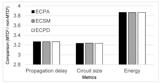 Figure 12 summarizes overheads of the circuit implementation using design approach over the same evolved circuit without circuits. Results indicate that design leads to 3.27×, 3.24×, and 3.87× higher propagation delay, circuit size, and energy, respectively, as compare to the non- design. Thus, it is evident that -based circuits have more overhead with respect to pure combinational circuits that do not use . However, these costs come with the advantages of nearly constant power consumption during operation, low noise and electromagnetic emanations, which provide enhanced resilience against SCAs. Nevertheless, the overhead of our secure design is much lesser than some prior secure designs [50], that is, 3× for our secure design versus 6× for some prior secure designs [50]. We note that designing circuits that incur minimum propagation delay, circuit size, and energy overheads as compared to the baseline circuits is a challenging endeavor. As process technology advances, we believe the overheads of will be reduced due to the improved transistor device performance and energy efficiency. An efficient trade-off between the security and overhead (e.g., in terms of delay, area, and power) is an important research topic, though we leave thorough investigations on this trade-off as our future work.