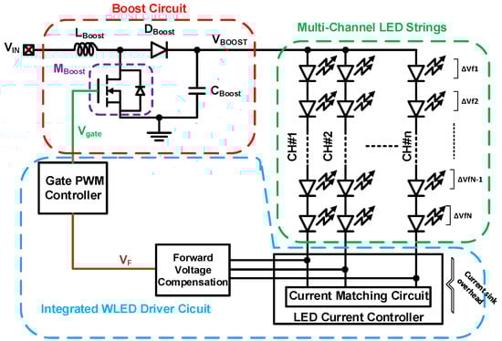 To overcome the disadvantages above of the typical architecture, multiple independent output WLED drivers are becoming the mainstream topology [,]. However, this comes with a potentially higher number of switches per string, more complex control circuitry, and multiple circuits (one per output) for common features such as over-voltage protection (OVP).