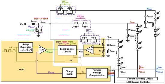 Figure 2 shows the overall block diagram of the proposed architecture. This WLED driver is based on a boost converter with a single common inductor (); a common main switch (); a high-side switch; an output capacitor for each independent output (string); a current matching circuit; and a maximum duty cycle controller (MDCC) that consists of a forward voltage compensation circuit, a charge pump, a PWM block to control, and a drive for the main switch. A simple pulse skipping controller (PSC) is used to control the gates of the high-side switches. For optimal power efficiency of 18 WLEDs, typically enough for a smartphone backlight, WLEDs are arranged as three strings; each has 6 WLEDs [].