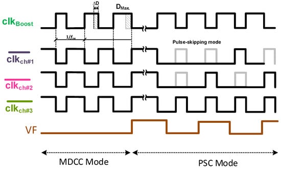 Figure 3 illustrates the timing of the different gate pulse drivers for the main and high-side switches. It shows how the PSC starts pulse skipping mode on the high-side switches once the  has been reached at the main switch using MDCC. These waveforms reflect a scenario where the total voltage drop of WLEDs () in string 1 is the lowest and that in string 3 is the highest.