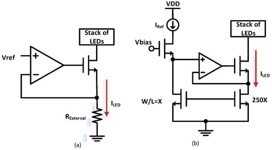 There exists more than one design for regulated current sinks placed in series with the WLEDs in each string [,]. Figure 4 depicts two possibilities. Figure 4a shows a regulated current sink using a high gain amplifier, a pass transistor, and an external resistor. In this case, the current that passes through each string of WLEDs would be . Adding a resistor would cause efficiency degradation due to a power loss of . The parasitic resistance of the pin should also be estimated and included in the calculations to have more accurate current values. To overcome the parasitic effect,  needs to be large which causes more power dissipation. On the other hand, if the resistor is integrated into the same IC, it would have large tolerance due to the process and temperature variation, which may lead to error in the driving current and consequently change in the color brightness.