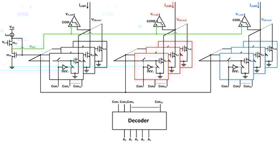 Figure 5 shows a schematic diagram of both current matchings along with the forward voltage compensation circuits. The current matching circuit consists of a current mirror to produce multiple current sinks, one per string. The reference current  which is generated by a bandgap circuit (not shown) is used to bias transistors  and to generate the reference voltage  of comparators , , and . This  is designed to be around 250 mV. Note that the comparators are utilized to force the same current in each string (,  and ). This is accomplished when the  of each transistor matches the reference voltage . Since  mismatch is the biggest factor that could cause a mismatch in the current mirror, this method ensures that it never happens. Each string current sink is composed of 25 segments to allow dimming and brightness control of 25 steps (1 mA each). A minimum of a 5-bit decoder is needed to attain a step of 1 mA. The insertion and deletion of the 25 current segments in each string is done via the 5-bit input to the 25-output decoder, as shown in Figure 5.