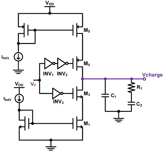 The single-ended charge pump circuit, which is part of MDCC, is shown in Figure 8. It integrates the pulses from the  signal and generates a control signal  to be used in the PWM comparator.  and  function like a current source and a current sink, respectively. Signal  drives PMOS pass device , and an inverted version of  drives the NMOS pass device . The R1–C2 combination circuit adds a zero to the charge pump compensation circuit to enhance the phase margin, and thus the stability of the system.