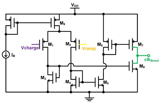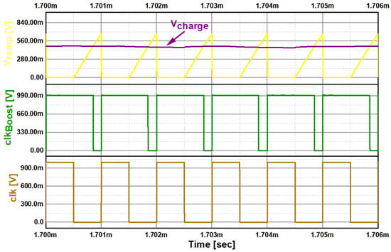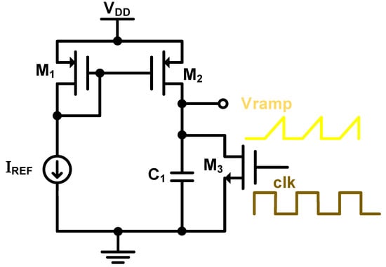 Figure 9 depicts a ramp generator circuit to be used at the other terminal of the PWM comparator. It consists of a simple current source (), a capacitor , and a clock-driven switch . The clock is running at the switching frequency of the boost converter, which is 1 MHz.