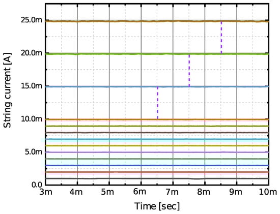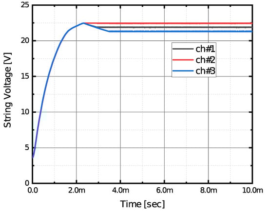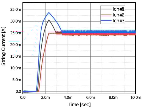 Figure 13 shows the currents in each string. The steady-state value is equal to the targeted value of 25 mA in each string. Of course, the steady-state value can be 1 to 25 mA as per the decoder input, as explained before. The lowest voltages of the three strings show higher currents compared to the highest voltage string while searching for  in the MDCC mode of operation. Once the  has been reached, the higher current starts going down (PSC mode starts) and continues until it reaches a steady-state of the targeted value of 25 mA.