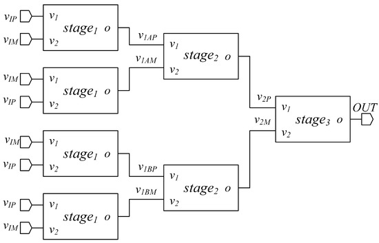 The block scheme of the proposed OTA architecture is depicted in Figure 1. This architecture of ULV OTA was derived from the OTA introduced by the authors in [20] and is a three stage, tree-like OTA, made up of the cascade of differential-to-single-ended converter stages, to maximize CMRR. Three different topologies are exploited in the three stages of the OTA to optimize the tradeoff between performance and efficiency. Each one of these stages was extensively investigated and their behavior is discussed in the next subsections. It has to be remarked that the proposed ULV OTA makes extensive use of the body terminals of MOS devices and thus it can be implemented only in CMOS technologies (such as triple-well-bulk or FDSOI), where both NMOS and PMOS transistors have available body connections. However, this is not a strong limitation, since most modern processes have available body connections for both PMOS and NMOS transistors.