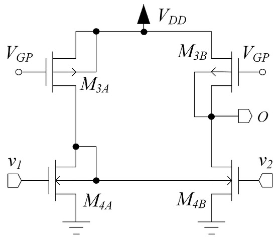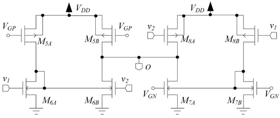 The topology of stage is shown in Figure 5. This stage combines the signal behavior of an inverter-based pseudo-differential pair (Arbel topology) with differential-to-single-ended conversion through the body current mirror and robust biasing, and is composed by an n-input and a p-input stage similar to that of Figure 4, but without diode loading, connected together. The signal is applied to the gates of two PMOS and two NMOS devices, respectively and , and the body-diode connections in and implement body-driven current mirrors performing differential-to-single-ended conversion and common mode current cancellation. Transistors , and and act as current sources and are exploited to set the bias current in all the branches of the third stage through and , respectively; thus, each transistor has a well-defined bias point.