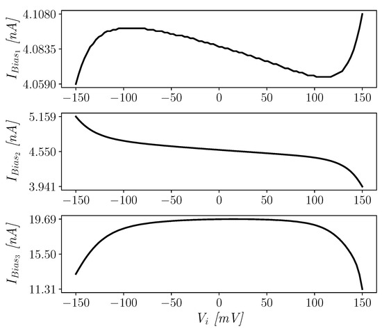The transistors in the stages implementing the architecture in Figure 1 were sized as reported in Table 1. The bias voltages and in Figure 2, Figure 4 and Figure 5, are generated by the biasing circuit shown in Figure 3. Moreover, the sizing of the NMOS transistors and and of the PMOS transistor () of the biasing circuit are reported in Table 1. The voltages and propagate the bias current, nA, through body-mirroring or gate-mirroring.