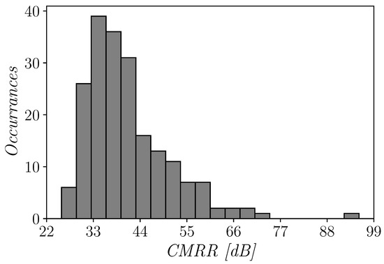 reports the histogram of the CMRR that clearly shows a log-normal distribution, probably due to the sub-threshold operating condition of the circuit. The architecture exhibits a CMRR up to 98dB for some iterations (as expected from theoretical results in Section 3.2), and remains relatively high under mismatch variations, with a mean value of about 42 dB.