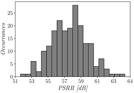Histogram of the power supply rejection ratio (PSRR) of the proposed OTA for 200 Monte Carlo mismatch iterations.