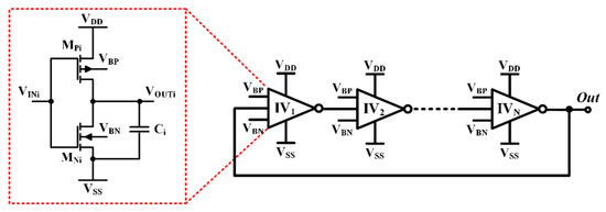 CMOS COs can be categorized in two main families. The first includes LC resonant oscillators and, the second, ring oscillators. LC oscillators are mainly used in applications where both a high-phase noise and quality factor (Q) are required. Due to their spiral inductors’ large area and high-power dissipation, they cannot be used in ultra-low-power systems on a chip and where physical dimensions must be limited [10]. As is well known, ring oscillators (ROs) consist of an odd number of cascaded delay elements, usually identical to each other, that form a ring where the last stage output is connected to the first stage input. A further categorization is performed based on the control variable, which is often a voltage or a current.