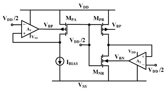 Figure 1 shows a circuit schematic of the proposed current-controlled ring oscillator (CCRO). It consists of an N-stage ring oscillator in which the single stage is made up of a CMOS inverter where bulk terminals of both transistors (MPi and MNi, with i = 1, 2, … N and N an odd number greater than 3) are made accessible. An output capacitor, Ci in the red-dashed box, is added at the output of each stage with the aim of setting the nominal oscillation frequency (coarse tuning), and to locally make the single stage insensible to parasitic capacitances, as will be clarified in the next section. The body potentials of both transistors, VBP and VBN, are generated from the auxiliary topology depicted in Figure 2, the aim of which is to establish the maximum current flowing in the reference inverter (MPR-MNR), i.e., when the input is at the logic threshold, VDD/2. For this purpose, in quiescent conditions, the input terminal of this reference inverter is set to VDD/2 and, thanks to the overall negative feedback implemented by error amplifier A2, such condition is transferred also to the output. Note that also the drain voltage of transistor MPA is kept to VDD/2 thanks to A1. This allows us to set the same nominal operating points for both MPR and MPA.