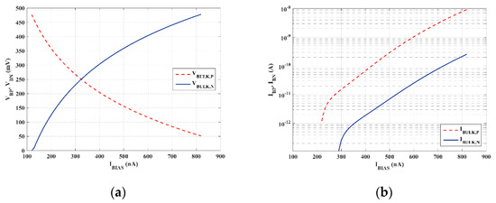Figure 6a shows the body voltages of the transistors involved in the reference inverting gate for a sweeping of the biasing current, IBIAS, in the range 120 nA–820 nA. The voltages fall within the supply rails and, in particular, it is easy to observe that their behaviors are symmetrical, confirming a good sizing of the block and the possibility to exploit the full dynamic range of the control voltages. Currents entering in the body terminals have been also evaluated and reported in Figure 6b to highlight that body junctions are never fully turned on during the control operation. In fact, the values of body currents in the worst case (PMOS), reach around 10 nA, corresponding to less than 2% of the biasing one.