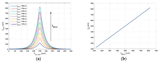 Figure 7a depicts the current flowing in the reference inverting gate when its input is varied from 0 to VDD (500 mV). As expected, the maximum is achieved for VDD/2 and accurately follows IBIAS as a validation of the effectiveness of the exploited biasing strategy and the linearity of the relation between the two quantities as well.