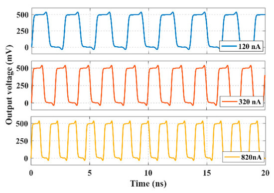 Figure 8 illustrates the output signal of the 5-stage CRO with Ci = 10 fF for three values of biasing current, 120, 320, and 820 nA, representing the minimum, nominal and maximum value, respectively.